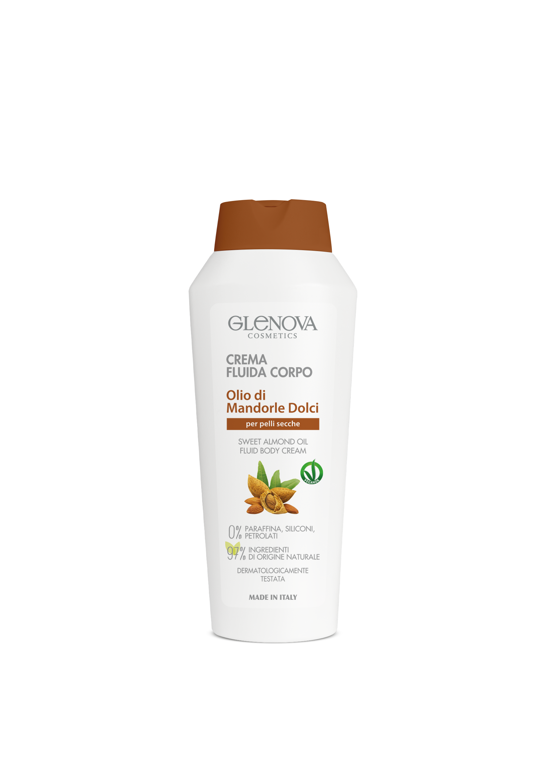 La Crema Fluida Corpo Olio di Mandorle Dolci Glenova rappresenta un valido aiuto per il trattamento delle pelli aride e stressate. Formula arricchita con Olio di Mandorle Dolci e Aloe Vera, coadiuvanti cosmetici noti per le loro proprietà vellutanti e lenitive. Modo d'uso: massaggiare su tutto il corpo fino a completo assorbimento.