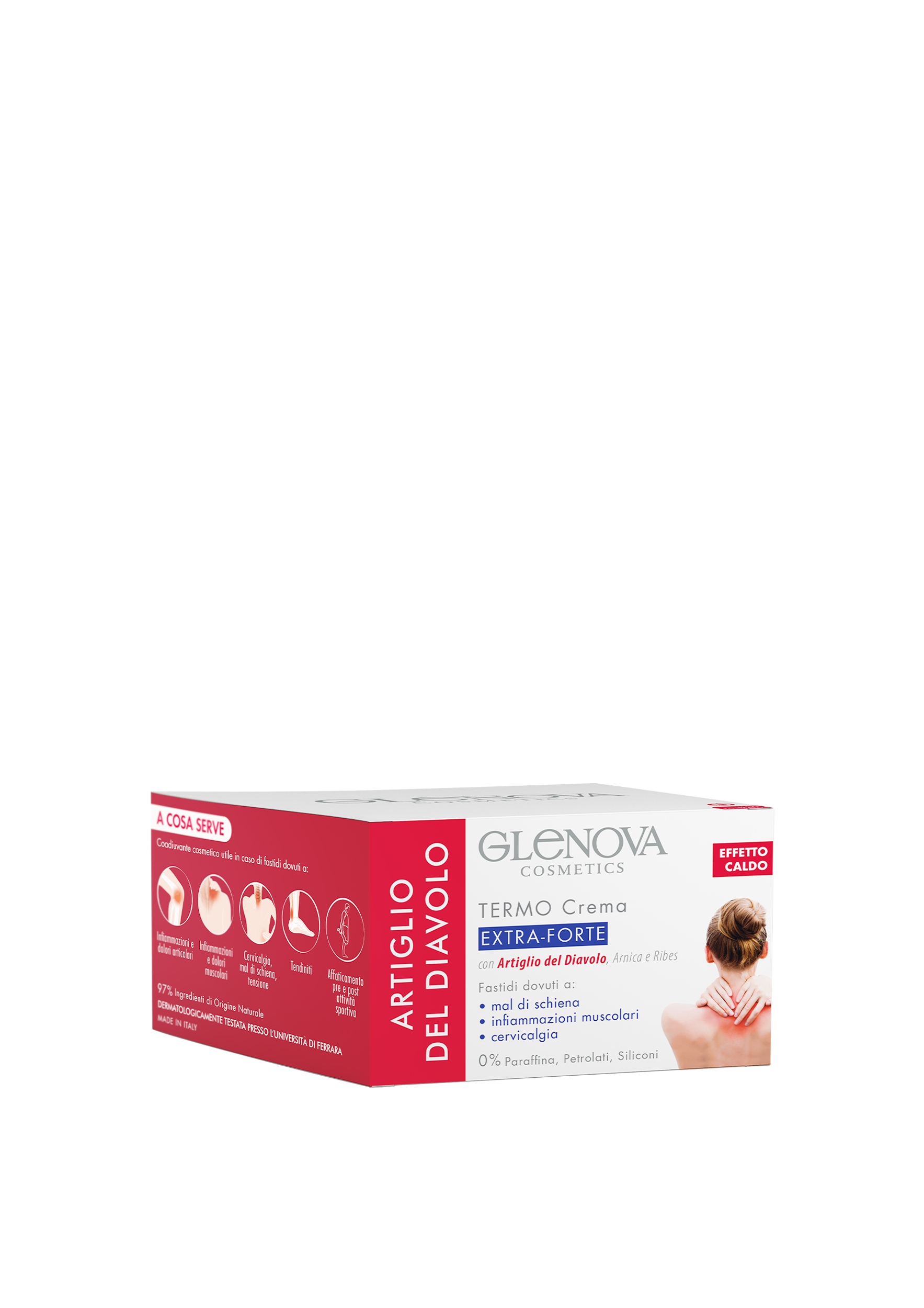 La formulazione della Termo Crema Extra-Forte Artiglio del Diavolo Glenova, è stata appositamente studiata combinando gli estratti vegetali di Artiglio del Diavolo, Arnica Montana e Ribes Nero. Per rendere il trattamento ancora più efficace la formula è stata arricchita con un Complesso Termogenico utile per favorire la sensazione di calore sulla zona da trattare e aumentare la funzionalità e l'efficacia del prodotto. Modo d'uso: applicare generosamente sulla parte interessata e massaggiare per qualche minuto, curandosi di esercitare una leggera frizione per un'attivazione efficace dell'effetto termico. Ripetere l'operazione anche più volte al giorno se necessario. Se ne consiglia l'applicazione anche prima dell'attività sportiva per favorire il riscaldamento muscolare.